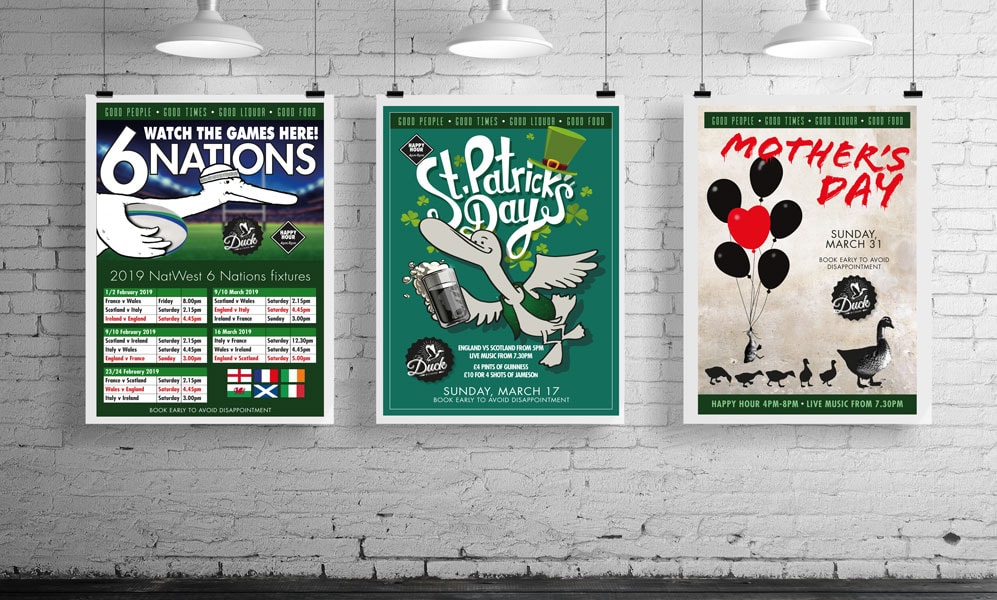 It’s been a busy time down at The Duck bar and restaurant in Westbourne, Bournemouth recently, what with the Six Nations Rugby, St Patricks and Mothers days coming up shortly. So creativebyte have been hard at work creating their posters and also updating their food and drink menus. So if you have no plans for the weekend yet, don’t forget its Super Saturday, why not get down to The Duck and watch some great rugby.
